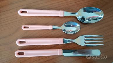 Vendo servizio di 24 posate in inox con manico in plastica rosa con stand, mai usate.
