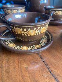Servizio da tè sei tazze artigianale in terracotta smaltata dipinta a mano con finitura lucida marrone. Visione e consegna a mano a Roma. Non spedisco. Non sono un commerciante: ho collezionato per me stesso nell’arco di una lunga vita cose che mi hanno dato emozioni e che ora alla fine di un percorso di decenni ho deciso di cedere. Invito a vedere gli altri miei annunci.