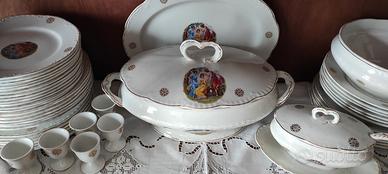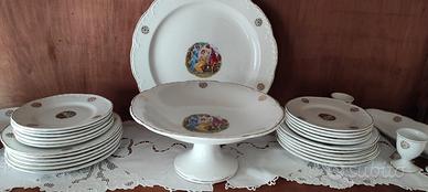 12 piatti piani, 12 piatti fondi,12 piattini frutta, 12 piattini dessert, 11 piatti pane, 1 Zuppiera con coperchio,1 insalatiera, 1 coppa con piatto per salsa, 11 porta uovo, 2 piatti grandi da portata, 2 piatti ovali aperitivo, 1 alzata portafrutta.