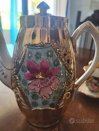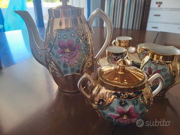 Servizio da caffè composto da caffettiera, zuccheriera e lattiera, 10 piattini e 10 tazzine, finemente lavorato. Le imperfezioni, sono dovute al tempo, perché sempre state in esposizione mai utilizzato.