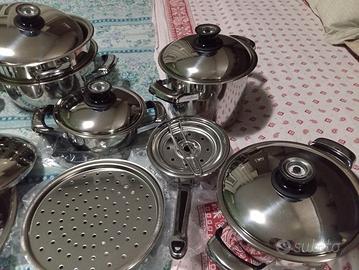 servizio dipentole Bavaria originale per cottura dietetica, senza grassi, triplo fondo completo di mestoli vari e ricambi maniglie e pomello, tutti i coperchi hanno i segna gradi, 7 pezzi cottura