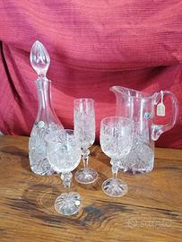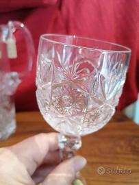 Bellissimo servizio vintage di bicchieri a calice di cristallo di Bohemia composto da 12 calici vino, 12 calici acqua, 12 calici flute, una brocca ed una bottiglia. Il tutto e' decorato con la iconica decorazione geometrica. Il tutto e' nuovo, mai usato e nelle scatole originali. Perfetto.