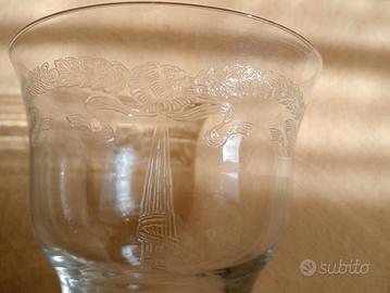 Servizio bicchieri di cristallo a tulipano finemente incisi , epoca fine '800, completo di 4 pezzi di misure diverse a posto e due bottiglie. Preferenza vendita in loco.
