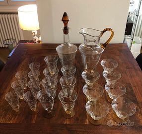 Servizio di bicchieri in cristallo intarsiato con caraffa e bottiglia, n. 8 bicchieri acqua, n 8 bicchieri vino, n.8 bicchierini da liquore.