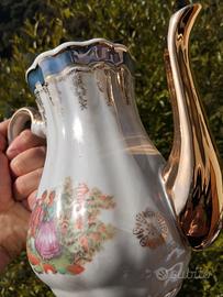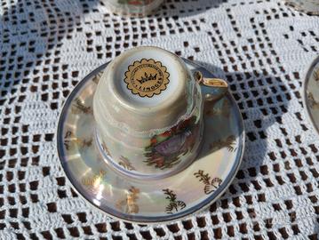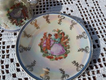 Porcellana, finitura a lustro opalescente e decori in oro zecchino, romantiche scene con "I Fidanzati" o "La Dama e il Cavaliere" e bordature in color glicine ... uno spettacolo!
