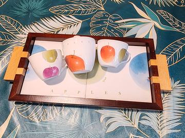 Servizio caffè decorato APPLES 2 persone 3 pezzi con vassorio in legno massello Viva Ceramiche.