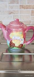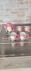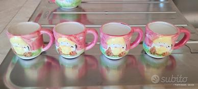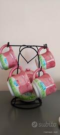 simpatico servizio da caffè in ceramica, con 4 tazzine e caffettiera, con apposito porta tazzine. Nessuna sbeccatura nè venature, come nuovo, mai usato.