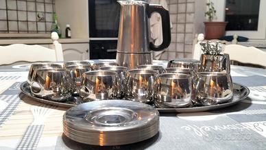 Servizio caffè da 12, con cucchiaini, tazzine, piattini, zuccheriera, caffettiera, lattiera e vassoio in acciaio AMC. Solo la caffettiera è stata usata.