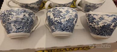 Servizio da caffè completo della manifattura inglese Myott Staffordshire, con l'iconico decoro "The Hunter" (Il Cacciatore) in blu e bianco.