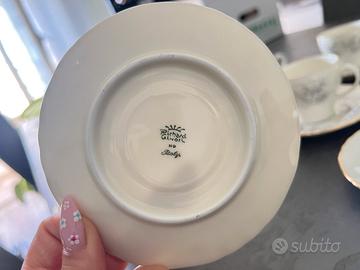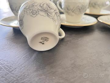 Splendido ed elegante servizio da caffè firmato Richard Ginori, eccellenza della porcellana italiana. Il set risale alla seconda metà del '900 ed è caratterizzato da un raffinato decoro a roselline grigie (modello stile "Lorena") con pregiati profili rifiniti in oro. 12 tazzine complere di piattini e zuccheriera.