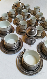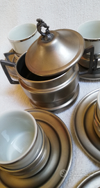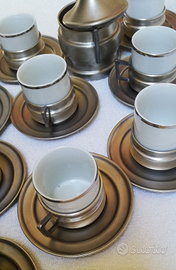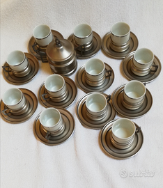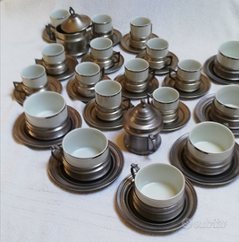 Servizio da caffe con 12 tazzine e servizio da the con 6 tazzine e con 2 zuccheriere. Le tazzine sono in ceramica bordate in oro e i piattini e le zuccheriere sono in peltro.