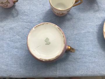 Servito in porcellana periodo fine '700 primi '800 (impero o restaurazione) Provenienza Francia, marchiato Limoges. Composto da 8 tazzine con piattino, lattiera, zuccheriera e caffettiera. (Lattiera e caffettiera hanno un pezzo - sotto - che deve essere incollato). Il decoro in oro zecchino é interamente eseguito a mano. La porcellana é finissima. Bellissimo set da museo dell'antiquariato.