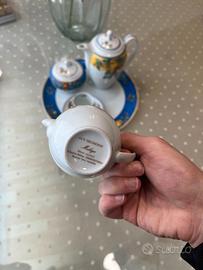 Servizio da caffè completo realizzato in porcellana a marchio Guy Degrenne. Il servizio è caratterizzato da un decoro classico a tema frutta (raffigurante pere, ciliegie e prugne con fogliame) su fascia gialla, rifinito con bordi a contrasto in blu cobalto. Il set include i pezzi per la mescita (caffettiera, lattiera, zuccheriera) e il servizio di tazzine per 12 persone.
