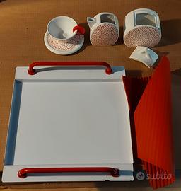 Per collezionisti. Servizio da caffè in ceramica MAS ITALY Designer Luigi Castaldi - Massimo Materassi, riconducibile allo stile Memphis, postmoderno, prodotto in Italia nei anni '80. Il set è composto da nr. 8 pezzi: 1 tazzina, 2 piattini, zuccheriera, coperchio zuccheriera, lattiera e vassoio originale in metallo verniciato bianco e maniglie rosse, tappetino rosso gommato antiscivolo.