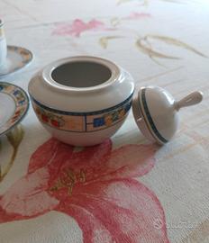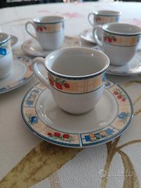 Servizio da caffè per 6 persone (6 tazzine e 6 piattini) completo di zuccheriera, per un totale di 13 pezzi. Il decoro a frutta e la bordatura geometrica in blu e giallo/arancio sono tipici di quell'epoca.