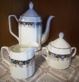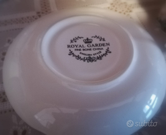 Servizio da caffè per 6 persone formata da 5 piattini e 5 tazzine, lattiera, zuccheriera e teiera ( Royal Garden fine bone China). Servizio in stile inglese. Buona occasione per collezionisti o amanti della porcellana inglese. È stato mantenuto il prezzo più basso poiché il servizio è da 5 pezzi (6 piattini e 5 tazzine)