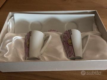 Servizio caffe’ con due tazzine e piattino per entrambi. In ceramica dipinta con fiori . Nuovo nella scatola originale