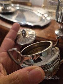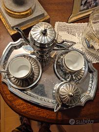 Servizio da caffè in metallo ( non sono in grado di affermare con certezza che lega sia)e porcellana, fine, decorata, blu e oro. Il servizio è di mia proprietà Almeno da 60 anni. Probabilmente è di un decennio più antico. Condizioni perfette.