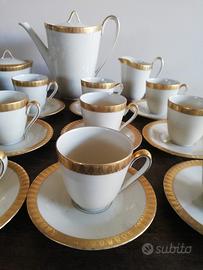 Servizio da 12 anni '50 in porcellana bianca della casa tedesca Zeh Sherzer, con un alto bordo dorato e lavorato. Senza alcuna sbeccatura e in perfette condizioni, a parte un piattino mancante.