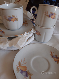 Servizio vintage anni 60/70 da caffè, composto da 6 piattini e 6 tazzine marchio Realty fine porcelain, con motivo di frutta, bordato in oro, usato pochissimo