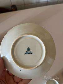 Servizio da caffè per 8 persone in fine in porcellana Renate Bavaria fine anni ‘50 in ottime condizioni, usato pochissime volte e lavato sempre a mano. Raffinata decorazione floreale e bordatura in oro bianco. Composto da: