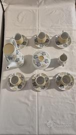 Il set è completo per 6 persone e include: caffettiera con coperchio + lattiera + zuccheriera con coperchio + 6 tazze da caffè + 6 piattini.