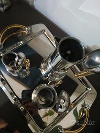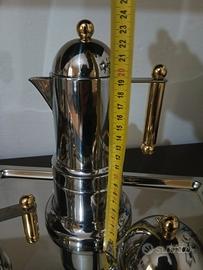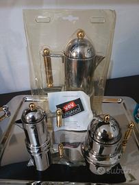 servizio con zuccheriera, lattiera moka (6 tazze, misure in foto) e vassoio. la moka è stata usata pochissimo, è adatta anche per induzione. vev vigano modello kontessa. Consegna a mano zona Bologna e provincia.