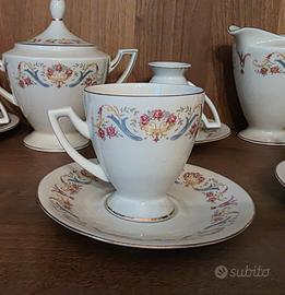 servizio in ceramica finemente decorata a tema floreale , composto da caffettiera, lattiera, zuccheriera, 10 tazzine con piattino+2 senza.
