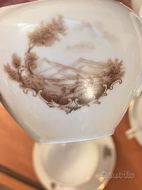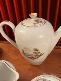 Servizio da caffè vintage in finissima porcellana bavarese Crown-Bavaria, composto da caffettiera, bricco latte, zuccheriera, 5 tazze e piattini, in totale 13 pezzi, colore panna con decorazioni marrone e oro. Proveniente da credenza nonna, sicuramente anni 60, tutte in condizioni perfette. Disponibile per altre foto e misure