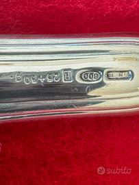 Vendo servizio Callegaro per 12 degli anni 70 punzonate Argento 800. Oltre al set per dodici, comprende un mestolo, un forchettone ed un cucchiaio di servizio, mai usati. Dettaglio del peso in argento 800: 12 Cucchiai + 12 forchette + 12 forchette frutta: 186 grammi x 12 = 2.232 grammi. Mestolo: 263g, forchetta di servizio 92 g, cucchiaio di servizio 130 g. Totale peso in argento 800, escludendo i coltelli: 2.717 grammi. Coltelli (compreso la parte in acciaio Callegaro): Coltelli portata 85x12=1020 + Coltelli frutta 63x12=756 g. = peso totale dei coltelli: 1020+756=1.776 grammi. Contenuto (conservativo) stimato in un terzo del.peso di argento 800 dei coltelli: 600 grammi. PESO TOTALE IN ARGENTO 800: 3 kilogrammi e 317 grammi. Per chi è veramente interessato, è facile calcolare il prezzo: costo del contenuto in peso di argento 800 più 500 Euro per la lavorazione. Informazioni aggiuntive: Peso totale delle scatole= 4.493 grammi. Si intende compreso i tessuti rossi di protezione e due scatole originali Callegaro, immacolati. Video/Foto a richiesta. Nota: gli oggetti sono nuovi. Preferisco il ritiro di persona dopo verifiche. Spedizione possibile solo dopo accordi precisi, a garanzia di entrambi. Accetto offerte solo se veramente congrue dopo reciproca conoscenza.