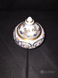 Cartier, Limoges, La Maison du Prince, servizio piatti di porcellana Francia, anno 1986 profilato in oro con bordo decorato a motivi di frutta entro riserve in blu cobalto e oro, composto da 24 piatti piani, 12 piatti da frutta, 12 piatti da pane, un piatto tondo da portata, un'insalatiera, una salsiera, 12 tazze da caffè, 12 piattini tazza da caffè, 1 bricco per il latte, 1 zuccheriera, marchio sotto le basi