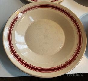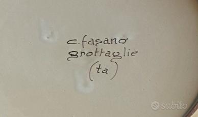Privato vende splendido set di 4 pezzi in ceramica artistica di Grottaglie, firmati a mano dalla storica e prestigiosa bottega di C. Fasano. Si tratta di pezzi autentici della tradizione pugliese, caratterizzati dal classico decoro a bande rosse su fondo crema, ideali per chi vuole arredare con gusto rustico, shabby chic o per valorizzare masserie, agriturismi e case vacanza. Il lotto è composto da: • 1 Bacile/Insalatiera grande: diametro 42 cm, profondità 15 cm. Un pezzo di rara maestosità, perfetto come centrotavola o catino ornamentale. • 1 Piatto Piano grande: diametro 42 cm. Ideale come piatto da portata o sottopiatto scenografico. • 2 Piatti/Vassoi: diametro 35 cm ciascuno. Perfetti per il servizio a tavola o per esposizione in credenza. Valuto la vendita separata dei singoli pezzi (prezzi su richiesta)