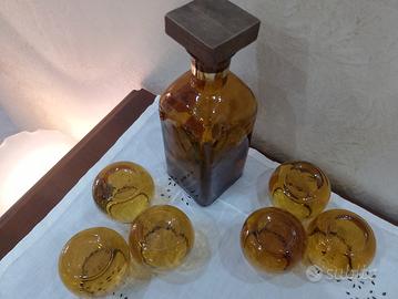 Servizio da Cognac Brandy composto da bottiglia quadrata in vetro marrone caramello ambrato con dettaglio dorato, con tappo in legno e sughero e serigrafia logo Brandy Cognac Magno Osborne