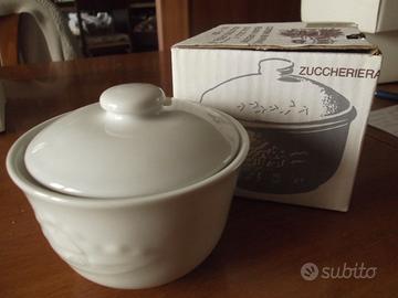 Servizio in porcellana bianca con disegni a rilievo MULINO BIANCO: 8 tazze con piattino capacità cc. 200; 2 tazzoni capacità cc. 350; 1 biscottiera diametro cm. 20 altezza cm. 11 + coperchio; 1 teiera; 2 zuccheriere. Tutto made in Italy. In blocco € 40.