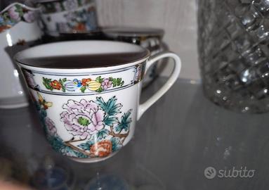 Fantasia floreale. Completo di teiera, 6 tazzine, 6 piattini, una zuccheriera e una lattiera. Dipinto a mano