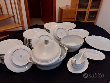 12 piatti piani, 12 piatti fondi, 12 piatti frutta, 1 zuppiera con mestolo, 2 piatti tondi grandi da portata, 1 piatto ovale grande da portata, 1 salsiera con mestolo, 1 insalatiera, 1 piatto ovale medico.