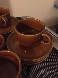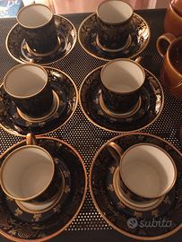 Vendo servizio completo di sei tazze da the' con relativi piattini e zuccheriera in porcellana color caramello e servizio da sei tazzine e piattini da caffè in porcellana smaltata blu a disegni e bordino d'oro zecchino, tutto originale anni'60 e perfettamente conservato. PREZZO NON TRATTABILE. NO SPEDIZIONE.