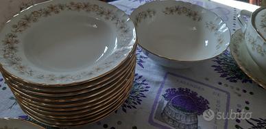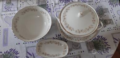Servizio completo " Richard Ginori " di piatti da cucina, ( 40 pezzi) comprendente: n°12 piatti piani, n°12 fondine, n° 12 piattini, n° 1 pastiera, n°1 zuppiera, n° 1piatto porta zuppiera, n°1 posa mestolo. Molto elegante, con bordatura a filo dorato. Il servizio è in perfetto stato e non è mai stato utilizzato.