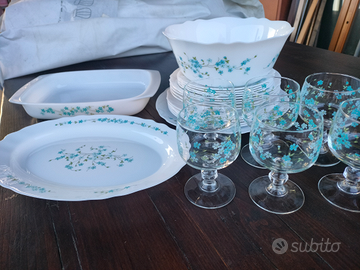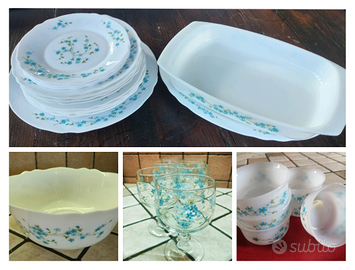 Set COMPLETO per 6 persone di piatti, vassoi, pirofila, zuppiera, coppette e bicchieri vintage marchio ARCOPAL in vetro opalino temperato francese con rappresentati delicati fiorellini blu azzurri "non ti scordar di me" "Myosotis" "Veronica" . Mai usati, qualche minimo segno di usura che è possibile vedere in foto.