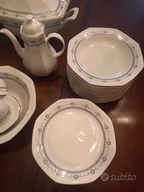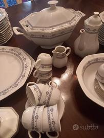 Servizio completo in ceramica di Schirnding Bavaria.. con motivi piccoli floreali e rifinitura in platino...12 piatti piani, 12 piatti fondi, 12 piattini, 1 vassoio ovale lunghezza cm 34, 1 vassoio tondo diametro cm 29, zuppiera lunghezza cm 36, insalatiera cm 25, 12 tazzine con piattino e bricco latte e bricco caffè.