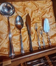 Servizio posate anni 70 placcate in argento "90" da 12 con forchetta, coltello, cucchiaio - posate dolci - cucchiaini dolce e caffè - 6 utensili da portata - MAI USATI - contenuti in scatola originale imbottita. Perfetti e molto eleganti e belli