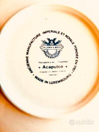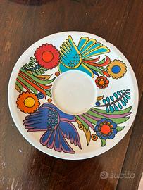 Famoso servizio di stoviglie Acapulco di Villeroy & Boch. Questa linea è stata prodotta dal 1967 al 1980 circa, con un design originale di ispirazione messicana creato da Christine Presenta un motivo vivace e colorato con uccelli, fiori e rami stilizzati, che lo rende un classico esempio di arredamento Pop Art e boho degli anni '70.