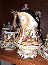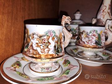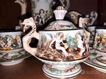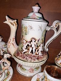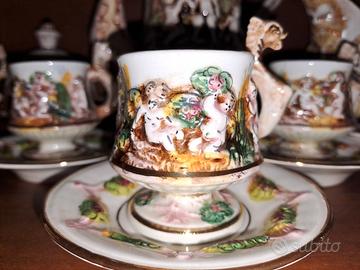 Servizio da caffè Capodimonte originale dipinto a mano, composto da 6 tazzine con piattini, caffettiera, zuccheriera, lattiera. Oggetto da collezione.