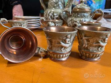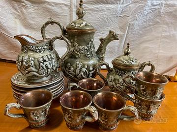 Servizio da caffè Capodimonte originale – decoro cherubini a rilievo – completo e in ottime condizioni Vendo elegante servizio da caffè Capodimonte originale, produzione R. Capodimonte – Italy, con marchio sottocoperta e numerazioni di modello 150/c e 130/c. Il set è caratterizzato da una lavorazione a rilievo di grande pregio con cherubini / putti, tipica della produzione Capodimonte. Ogni pezzo è rifinito a mano, con dettagli ricercati e una colorazione classica che lo rende ideale sia come oggetto d’uso sia come pezzo da collezione. Composizione del set N. 6 tazzine N. 6 piattini Caffettiera con coperchio Zuccheriera con coperchio Lattiera Condizioni Il servizio è in ottime condizioni, senza crepe né sbeccature. Normali segni del tempo compatibili con l’età, ma nel complesso ben conservato. Caratteristiche: Marchio: R. Capodimonte – Italy Numerazione: 150/c – 130/c Lavorazione artigianale italiana Consegna a mano in zona oppure Spedizione disponibile con imballo accurato.