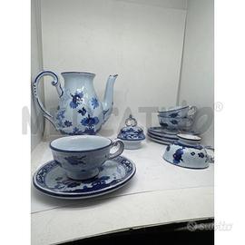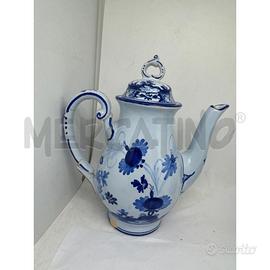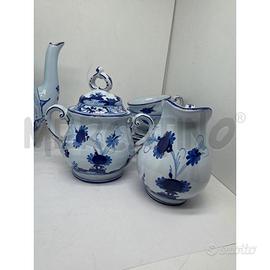 SERVIZIO DA CAFFE GAROFANO BLU TEIERA RIPARATA CON SBECCHI IL GAROFANO BLU E CONSIDERATO UN DECORO TIPICO DELLA PRODUZIONE IMOLESE ANCHE SE NATO IN TEMPI RECENTI INTORNO AGLI ANNI 40 50 DEL SECOLO SCORSO.FU L ARCHITETTO GIO PONTI CHE SPINTO DALLA RICER
