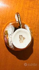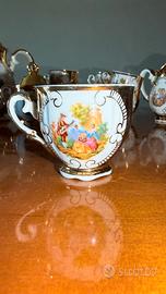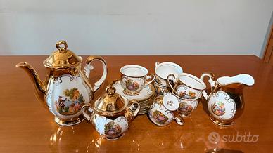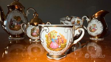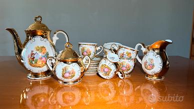 Raffinato servizio da caffè in porcellana Bavaria con dettagli in oro zecchino e scene romantiche in stile Settecento.