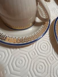 Servizio da caffè in porcellana bianca composto da caffettiera, zuccheriera, lattiera, 12 tazze e piattini. Porcellana decorata con bordo dorato e blu cobalto Condizione Molto buono
