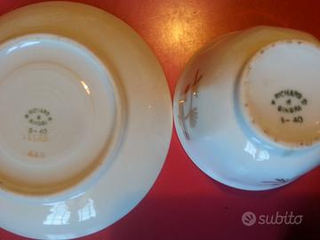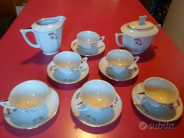 Vendo servizio da caffè da 6 persone (8 pz.), originale in ceramica Richard Ginori , probabilmente di epoca Liberty, con decorazioni dorate di gusto orientale stilizzato (japonerie) , composto da 6 tazzine e 6 piattini, una lattiera ed una zuccheriera .