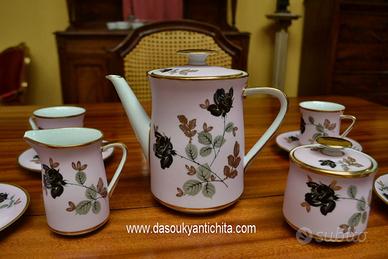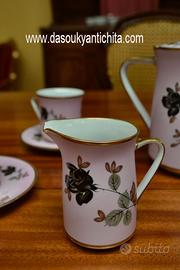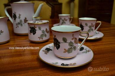 Elegante servizio da caffè per sei persone in porcellana di Sevres anni 50/60 Internamente bianco, esternamente smalto rosa, decorato a mano con boccioli di rose, finiture particolari in oro zecchino.