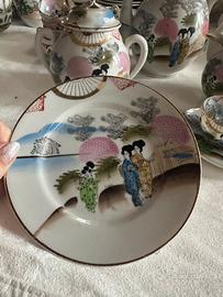 Vendo elegante servizio da caffè giapponese vintage, autentico anni ’50/’60, in porcellana dipinta a mano con decorazioni tradizionali raffiguranti geishe e paesaggi orientali.